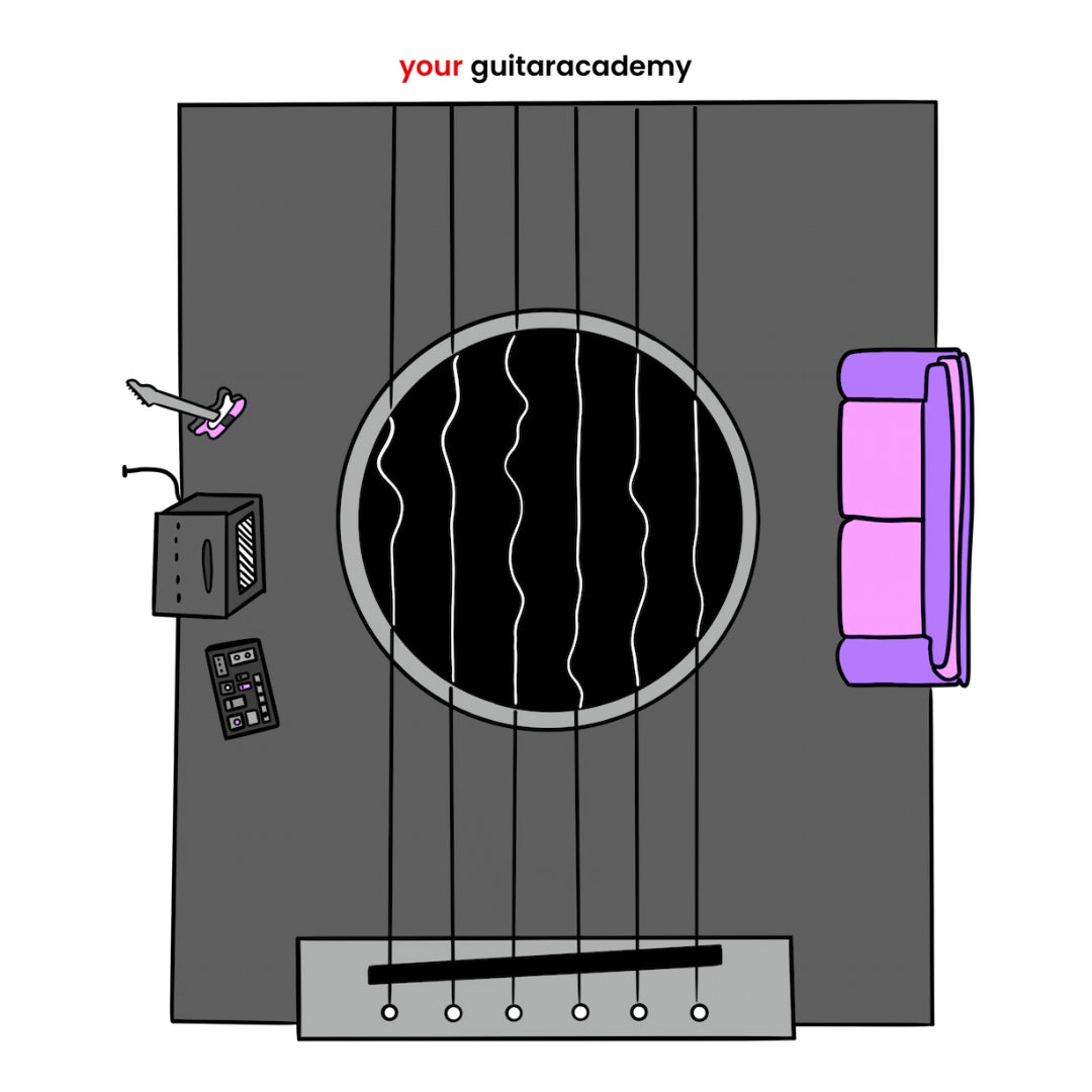 We completely fell in love with this design from the first moment our artist, Anne, sketched it out. The living room vibe, the resonating strings and the popping colours. As a guitar student, the living room is where you likely spend a lot of time sitting and playing, and this piece of art perfectly captures how the space changes to a guitar studio as you evolve as a player.