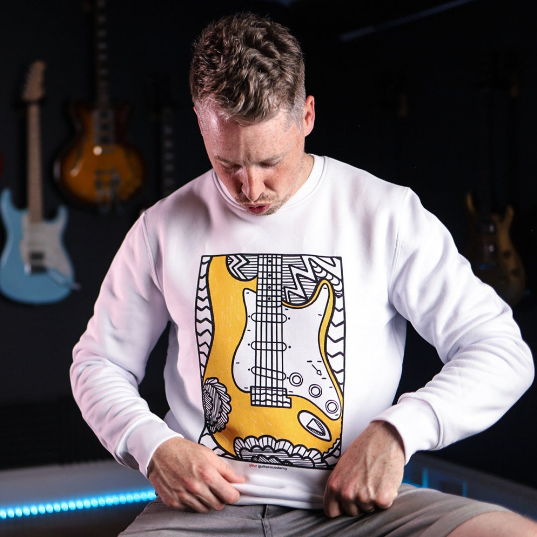 This is a celebration of the power of the guitar, and especially the Strat! The lighting strike symbolises that power, and the bold colour on the strat adds further energy to the artwork. This is a beautiful design that makes a striking sweatshirt.